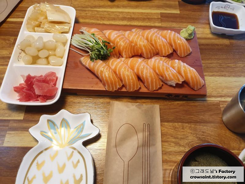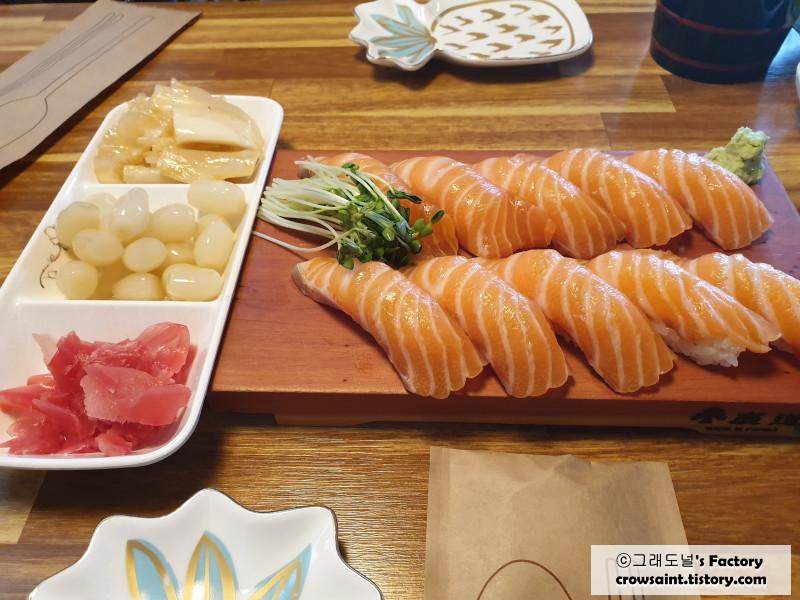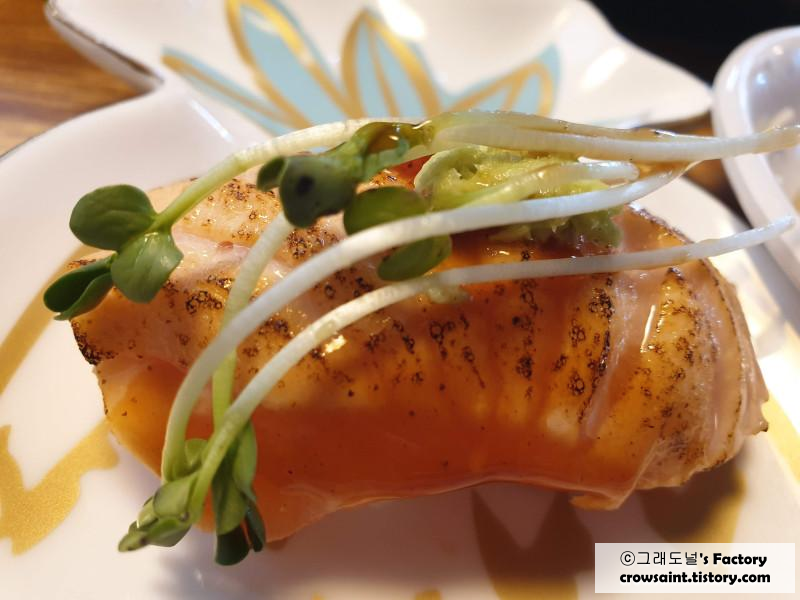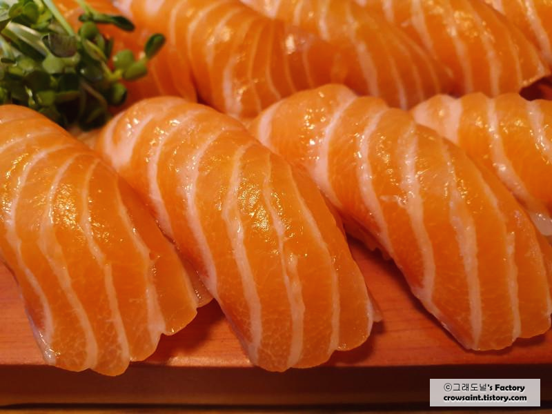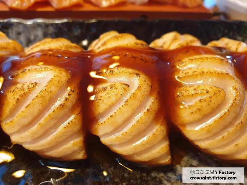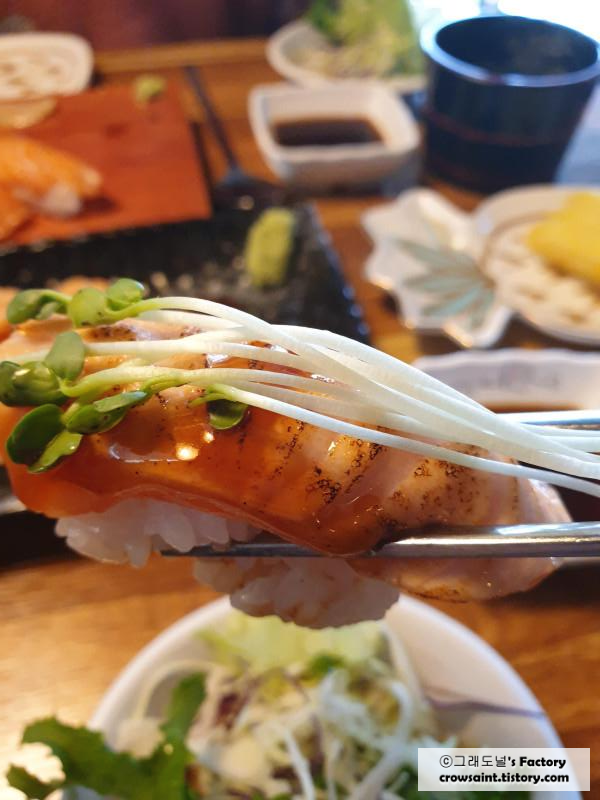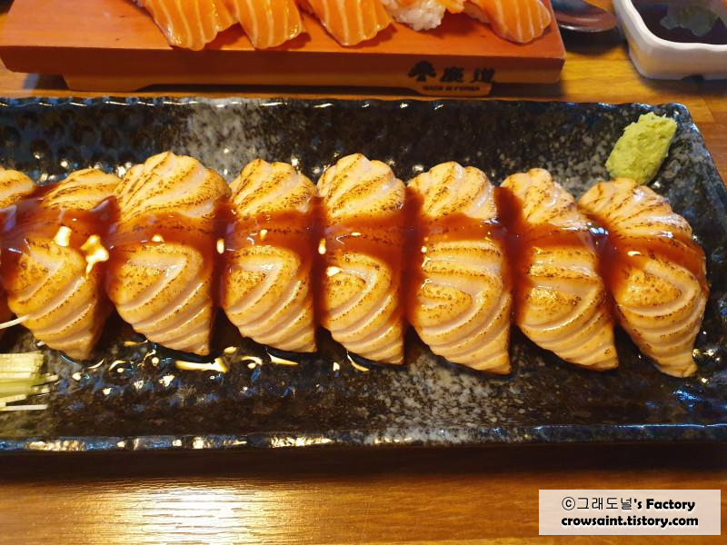 갯수는 연어초밥보다 적지만 불로 굽다보니 그냥 연어초밥보다 두껍게 썰어서 하나하나 연어 크기가 큽니다.
