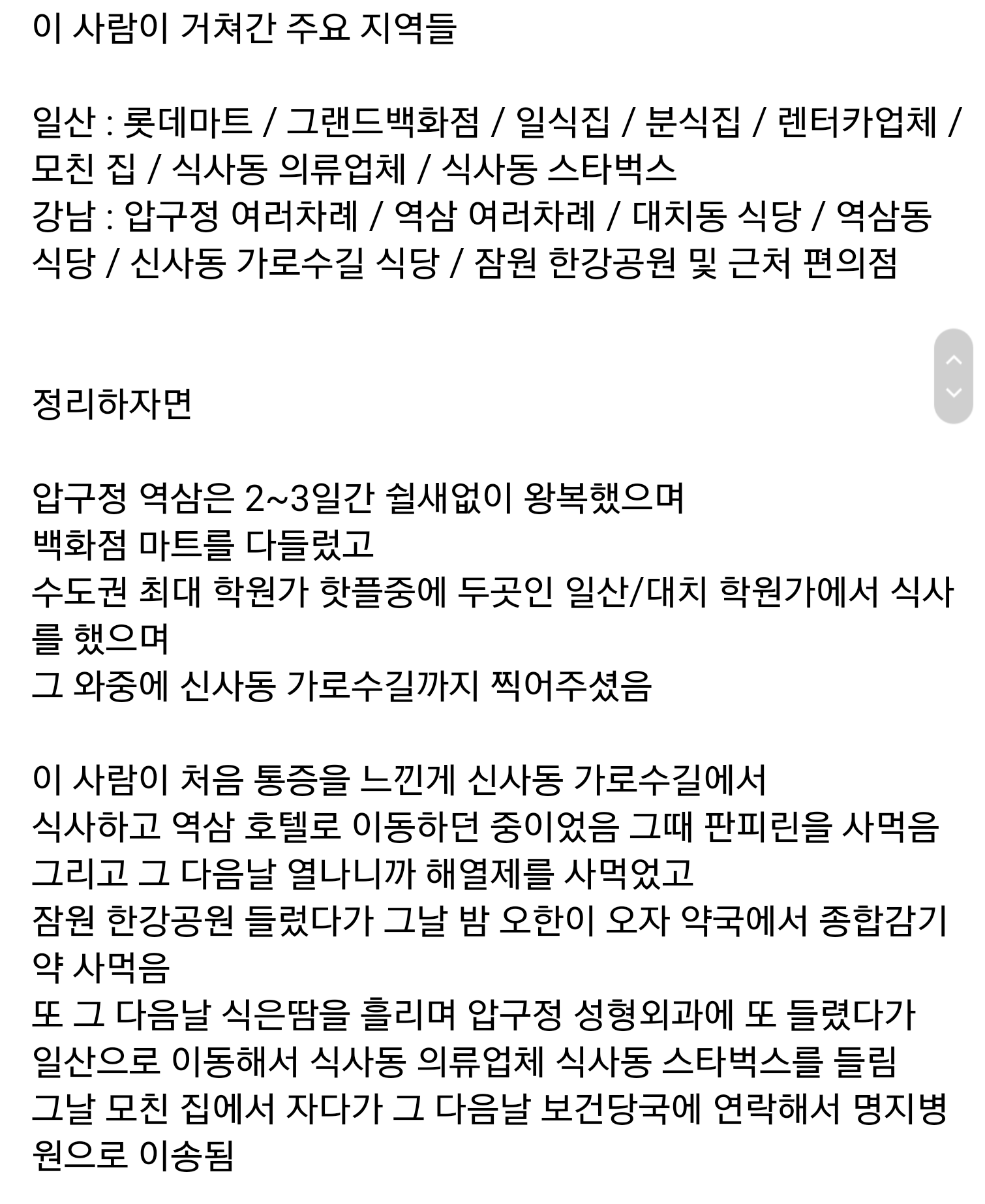 분명 발병한 지역에 있다가 입국을 한 것이고 통증을 느끼고 병원에 연락한 것이 아니고(그것도 신사동 가로수길에서) 역삼(인구수가 ㄷㄷ)갔다가 아픈데도 불구 한강공원갔다가 오한이 들고 식은땀이 나는데도 성형외과 갔다가 스타벅스를 들린다. 몰라서 그랬다고 이해한다 쳐도 솔직히 신사동 가로수길에서 통증을 느꼈을때 전화한번 걸어봐야 하지 않았을까?. 나름 그분께서는 억울하다는 입장이다.