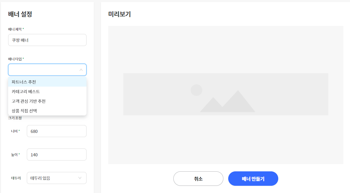 배너 이름을 적고 배너 타입을 정하고 크기를 조절하면 됩니다.
