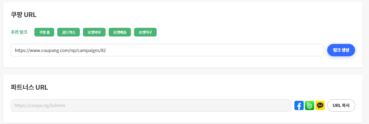 골든 박스나 로켓와우 로켓배송 등을 링크 붙여넣고 링크 생성을 누르면 됩니다.