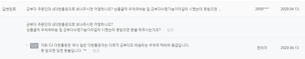 그런데 왜 그렇게 보내줬냐고 했더니 CJ 대한통운은 일반 대한통운과 다르게 우체국 택배와 동급이라고 답변을 달았다.