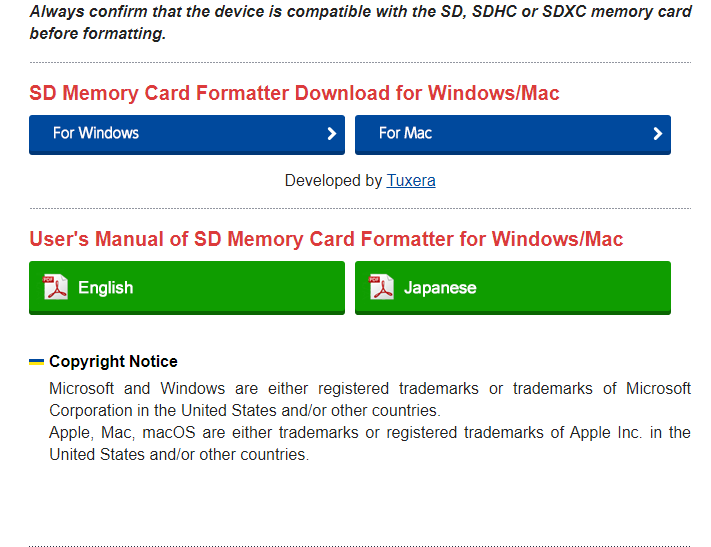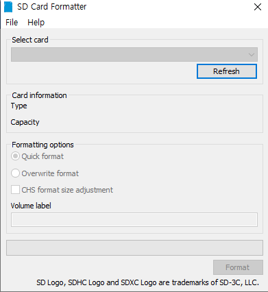 The SD Memory Card Formatter formats SD Memory Card, SDHC Memory Card and SDXC Memory Card (respectively SD/SDHC/SDXC Cards) complying with the SD File System Specification created by the SD Association (SDA).