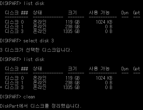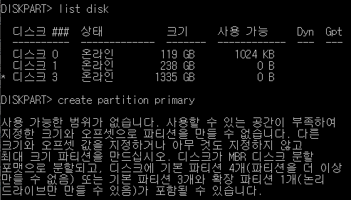clean으로 정리하고 기본 파티션을 잡으려 했으나 실패