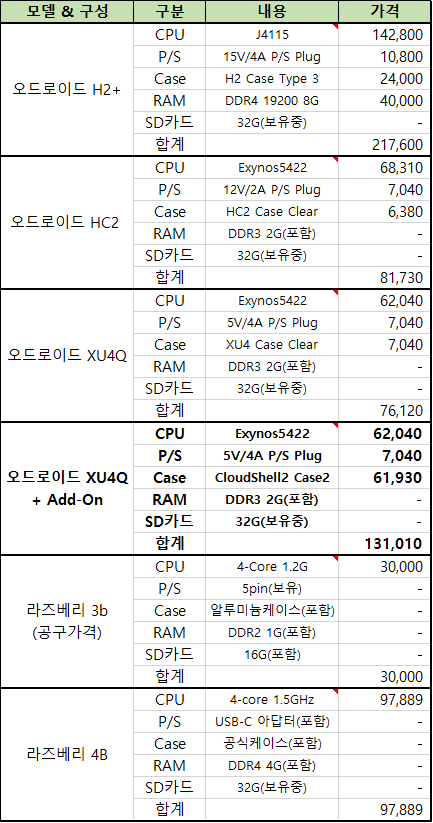 최종적으로 고민한 녀석들은 오드로이드의 H2+와 XU4Q