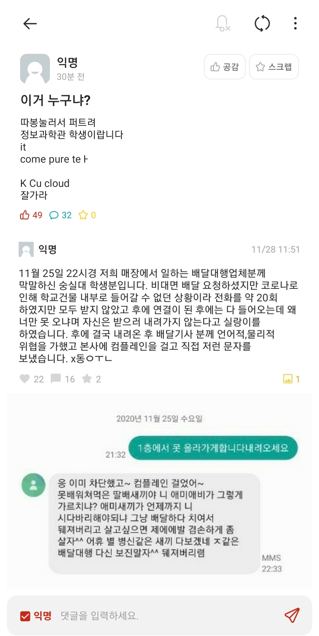 대충 내용은 숭실대 정보과학관 학생이 배달을 시켰고 비대면인데 학교로 못들어가서 전화를 수차례 한끝에 실랑이가 벌어졌고 대행기사에게 문자로 막말한 사건
