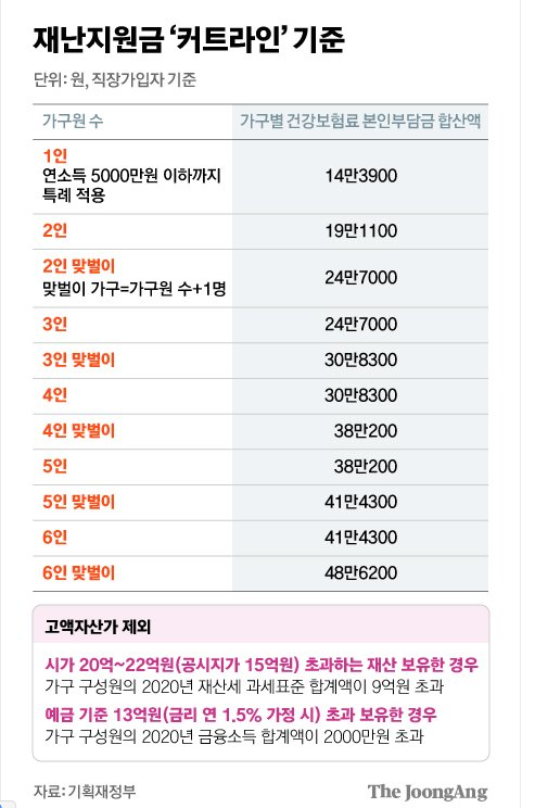 [출처: 중앙일보] 재난지원금 커트라인, 4인 맞벌이 건보료 38만원 이하 100만원